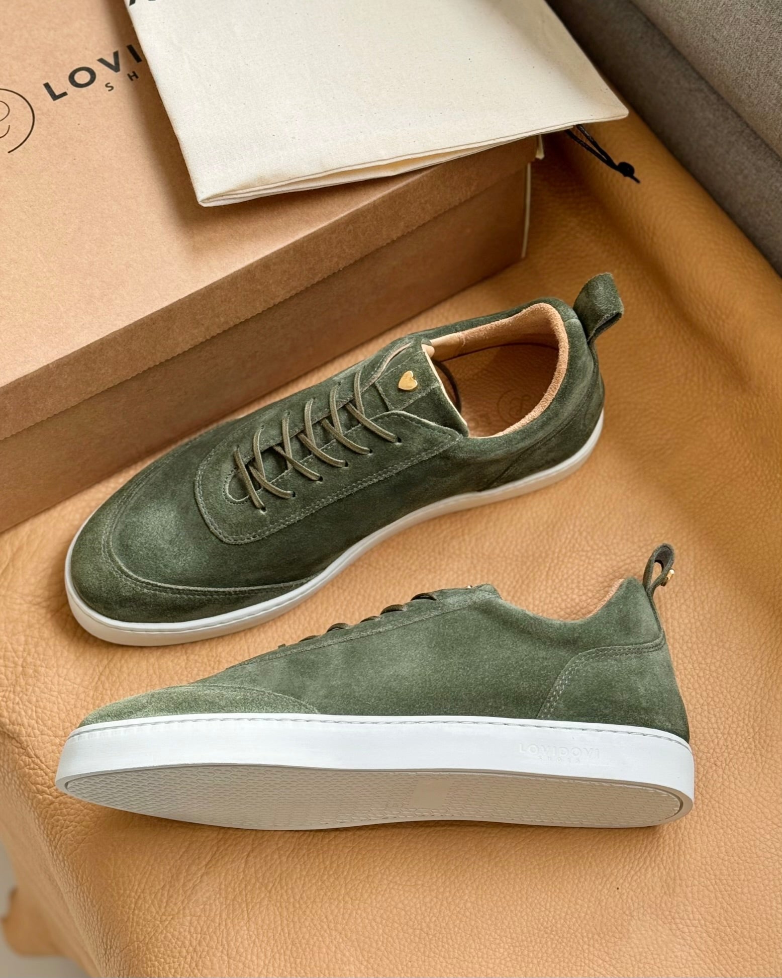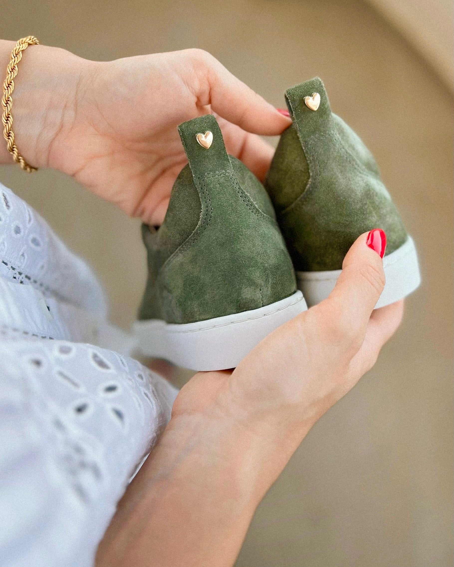 Jedes unserer Modelle verfügt über ein Herzdetail, das die Liebe und Mühe symbolisiert, die in die handgefertigte Herstellung jedes Paares investiert werden. Alle metallischen Herzdetails sind mit 24-karätigem Gold überzogen, was ihnen ein luxuriöses und elegantes Aussehen verleiht.